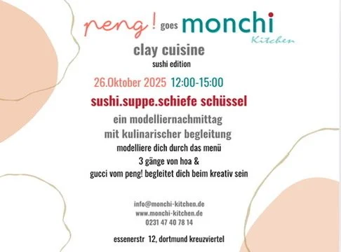 Bei “Clay cuisine” wird ein Sushi Set getöpfert, Stäbchenhalter, eine Schale , wie die genau aussieht liegt ganz bei dir. Ich begleite dich mit Tipps, wenn du magst – oder lasse dir bewusst den Freiraum, deinen eigenen Zugang zum Material zu finden.